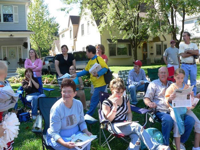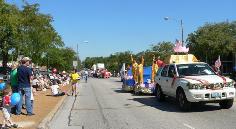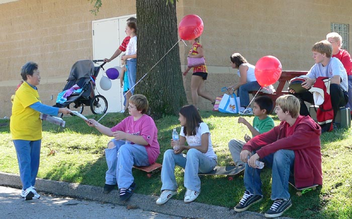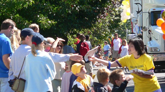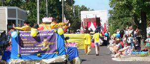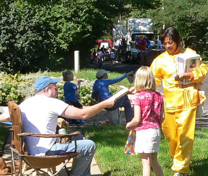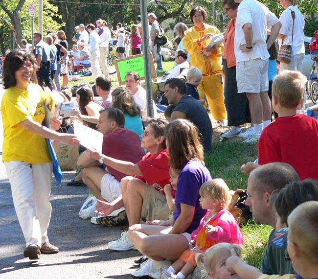 【明慧网2005年9月19日】2005年9月17日,美国圣路易法轮功学员第四度参加了科克伍得(Kirkwood)绿树节(Green Tree Festival)游行。当天天气晴朗宜人,人们纷纷来到户外观赏游行。如往年一样,法轮功学员的精美花车、功法展示、真象材料等获得民众的热情欢迎。