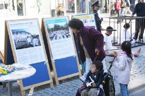 活动在繁华的商业街中心,一边是优美的炼功音乐及法轮功学员祥和的功法表演,另一边是模拟演示中共迫害法轮功学员的残暴酷刑,强烈的反差深深打动了当地居民,引来一批批的人观看。从人们惊讶愤怒的目光、同情的泪水和踊跃的签名中,可见他们内心的震动。