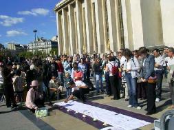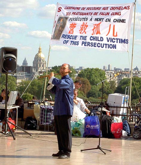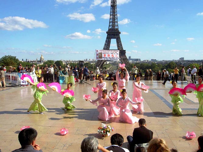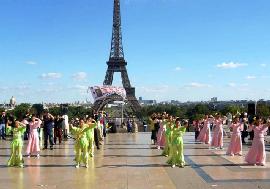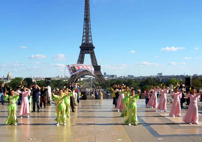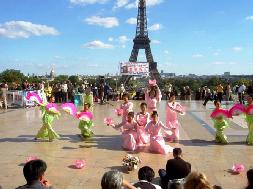 广场上来自世界各地的游客络绎不绝,法轮功学员们的活动场面在这熙熙攘攘的人群中和雄伟壮丽的埃弗尔铁塔的映衬下显得格外引人注目。悠扬、韵味深长的笛子独奏,婀娜、优雅的仙女舞蹈,以及深情的男声独唱,舒缓、优美的功法表演吸引着来往的游客放慢脚步,或驻足观看。