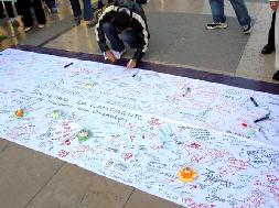 当游客们得知义演的主题是为营救法轮功学员的孤儿时,许多人向学员索要真象资料了解更多信息,并纷纷在“营救法轮功遗孤”的展布上表达他们对法轮功学员遭到迫害的愤慨和对法轮功学员孤儿的担忧和同情。许多天真的小朋友在听完父母亲的讲解真象后也在签名布上写下了自己的名字。很多游人,包括孩子们还和法轮功学员一起折纸莲花以表达对法轮功学员早日能获得自由信仰和自由生活的期盼。