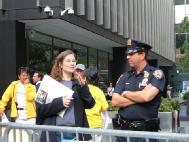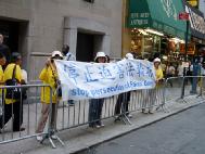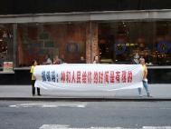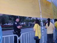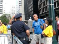 9月15日上午,学员们又在Lexington Ave 和49街交叉口的四个角落拉起了横幅。不久,警察过来对其中一位学员说:“这一边规定不让太多人站着,你们到对面去。”有学员不想离开,便衣先生就耐心的说:“我知道你们是在做什么,只是如果你们不合作的话,警察就会让你们都回到Park大道那个划定给你们的地方去了,那么你们就什么都看不到了。我向你们保证,你们就守着那个角落,一定能看到他。”