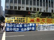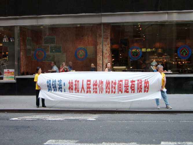 她们在里面等了将近两个小时。9点左右,一队人马来了,是中国人,再看看,象是胡锦涛。到跟前了,“唰”的一声,一条中文横幅“胡锦涛,神和人民给你的时间是有限的”,由两位西人拉着,展现在胡锦涛与他的随行人员面前。看着这横幅,他们都愣住了。