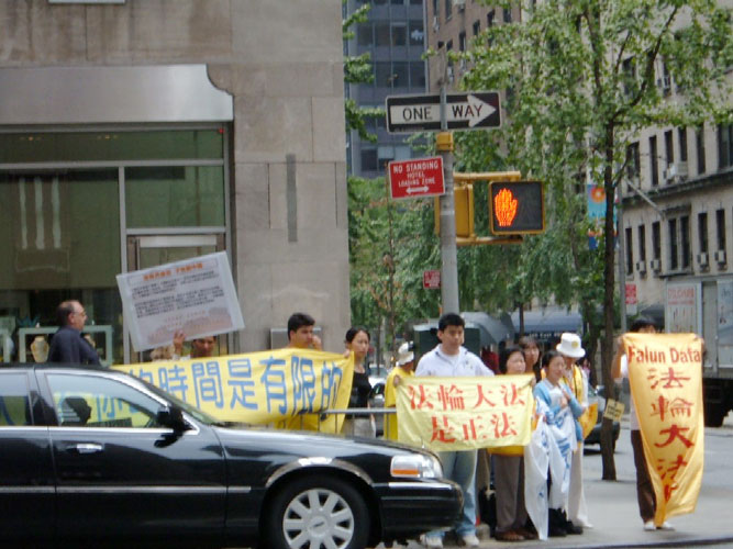 在胡一行将下榻的沃道夫酒店的四周,都有学员在等候。下午4:30 左右,胡的车队沿着Lexington Ave 向49街过来,守候在那的学员突然有人喊了一声:“法轮大法好!” 紧接着呼声连续不断:“停止迫害法轮功”,“法办江泽民,法办罗干,法办刘京,法办周永康”,“法办迫害法轮功的恶警和坏人”,“胡锦涛,神和人民给你的时间是有限的”。这些表达法轮功学员心声的呼声,胡一到美国就收到了。