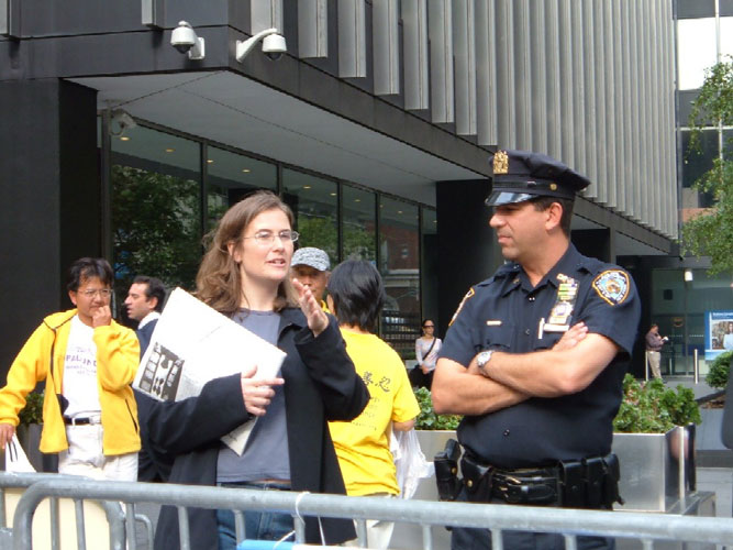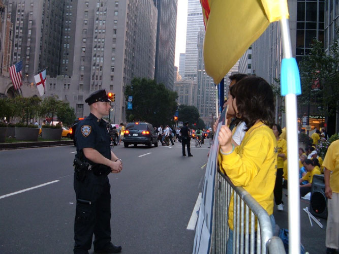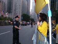 因为这几天联合国召开各国元首高峰会议,很多警察都是从其它地区调过来的,大部份还不知道法轮功。有位学员说:“我问了10位警察,只有一位警察说听说过法轮功。”后来这位学员就专给负责看护我们的警察讲真象。