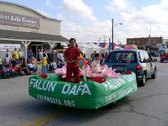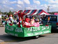 【明慧网2005年9月21日】一年一度的美国密苏里州布鲁斯普林斯城(City of Blue Springs)秋季庙会是当地及附近居民的一项重大娱乐活动。游行庆祝是人们观赏的重点,今年的游行庆祝的主题是:“神话会成为事实”(“Fairytales Can Come True”)。二零零五年九月十七日上午九点多钟,市内的主要街道已经被数万名兴致勃勃的观众占据了。尽管费了一些周折,大堪城地区的法轮功学员们还是准时加入了游行的队列。