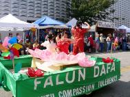 学员们精心布置的花车宛如一泓清新的荷塘,绿色的荷叶托着绽放的莲花。粉色莲花上正在打坐的可爱的小姑娘……伴随着宁静深沉的“普度”、“济世”音乐,醒目的绿底白字“法轮大法”,“真、善、忍”,仿佛将人们带入神话世界。“It is amazing!(令人惊叹!)”,“Wow, it is beautiful…(啊,真漂亮)”在掌声和赞叹声中,人们迫不及待的接过了学员们派发的真象资料。