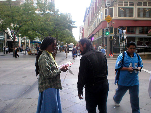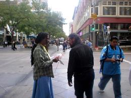 【明慧网2005年9月21日】在胡锦涛访美期间,科罗拉多州法轮功学员感到在这期间向科州民众讲清法轮功真象是很重要的。二零零五年九月十四日,学员们来到丹佛市中心散发营救法轮功儿童的传单。很多人为那些无辜的儿童在中共