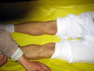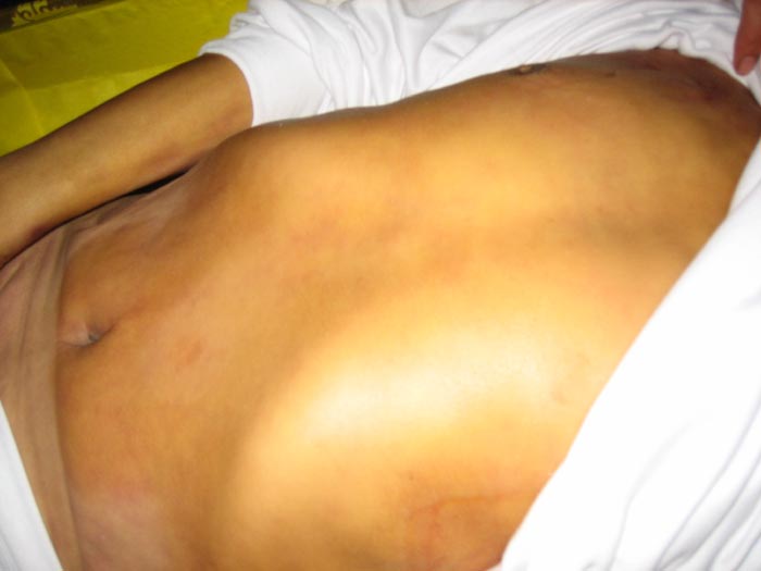 【明慧网2005年9月24日】2005年9月17日下午2点钟,黑龙江省双城市希勤乡治业村那振贤的家属们前去看望遗体,发现那振贤的遗体已明显的被处理过,但是嘴角的右边依然有明显的血迹,身体右腋下靠前胸侧处有巴掌大小的紫黑伤痕,靠身体前胸的腰上方也有手掌大小的明显伤痕,两腿有异常,鼻梁骨肿胀变形,左眼睛有外伤充血(见下图)。