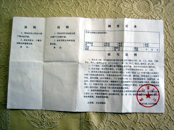 居民死亡医学证明书和死亡殡葬证(附图)上填写的日期都是2005年9月16日,在家属签名处签的“李剑峰”,那振贤家属表示,并不知道这个“李剑峰”是谁?从这些文件上不难看出,所有笔迹均为那个冒充家属的“李剑峰”所写,而且医学证明书是先盖章,后填写内容、后签字。那振贤家属说,并没有家属一个在场签字。