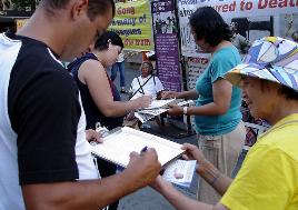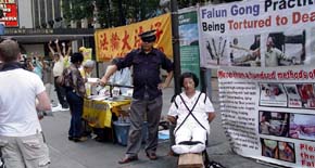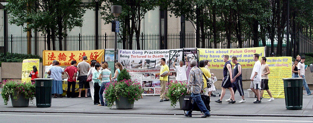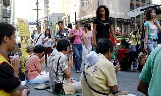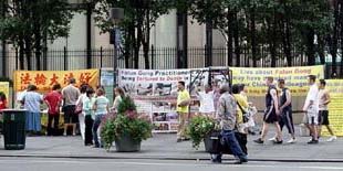 点一样,法轮大法弟子们向来往的人们讲述着在中国正在发生的