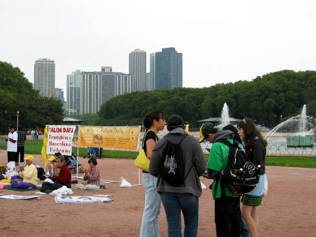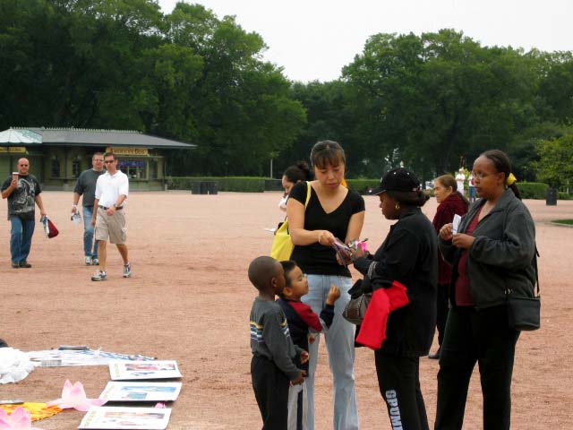 当芝加哥的小弟子们第一次在这里参与洪法讲真象的时候,他们纯朴的方式和笑容吸引了许多人,纷纷接过孩子们手中的传单,大多数的人们已经知道了法轮功并主动谈起他们在芝加哥市政府大楼前看到的反酷刑展等等,但是绝大多数的人们是第一次了解到因为这场迫害而牵连了诸多无辜善良的孩子们,人们为此震惊了。