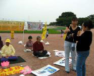 一个美国妇女在观看学员们炼功和真象展板后,坚定的说:“你们做了一件非常正确的事情。”并且签名支持。
