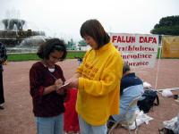 一对情侣在听完真象后,互相问对方:“你能够相信这是真的吗?”随后又驻足很久,看功法表演,看真象展板,询问遗孤的情况,最后说:“我们真的不敢相信所发生的一切,但是我们绝对支持你们,我们决定签名,希望布什总统也能够帮助你们。”