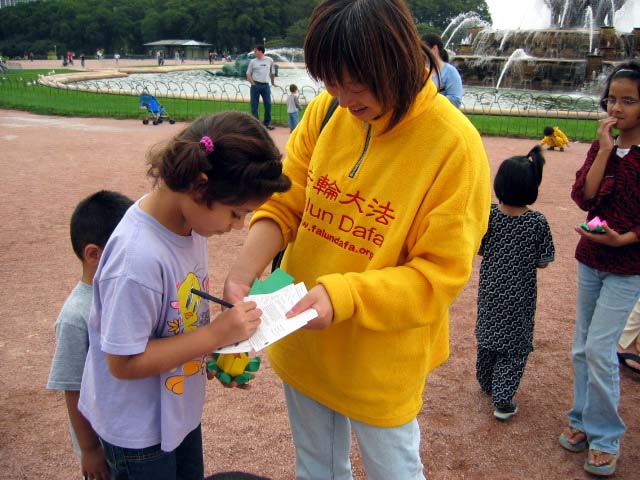 芝加哥明慧学校和当地的法轮功学员们一起配合,已经在白金汉大喷泉前组织过两次活动,让大批的来自世界各地的民众,特别是来自中国大陆的观光者了解真象,营救在中国受迫害的法轮功学员们的孩子们。白金汉大喷泉在这里也见证了感人的一幕幕: