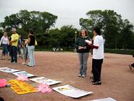 据芝加哥明慧学校负责人肖女士介绍:明慧学校将在白金汉大喷泉前继续展开营救法轮功遗孤的活动,并通过功法展示,图片展板和征集签名的方式让人们了解法轮功真象。一方面利用这个形式带动当地的小弟子们也参与洪法活动;另一方面,用“孩子营救孩子”的方式引起人们的关注,起到制止迫害法轮功的目的。