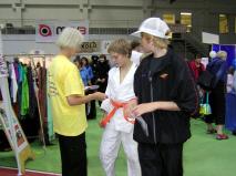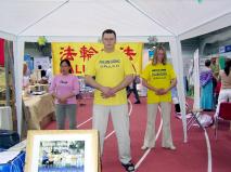 参观者踊跃来到法轮功学员的展位前签名声援终止在中国的迫害,看到在这里展示功法的法轮功学员的宁静祥和时,人们也十分关注在中国的法轮功学员所遭受的来自中共的恐怖人权迫害。
