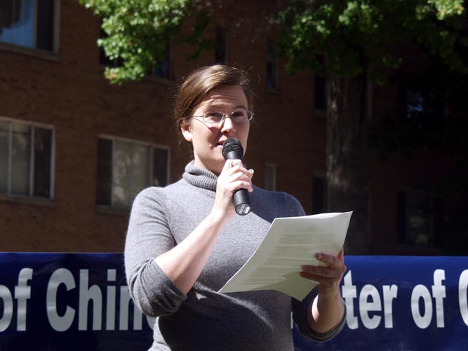 ![]() 要求禁止孙家正入境美国(明慧图片) | ![]() Laura Hattan 女士在发言(明慧图片) |