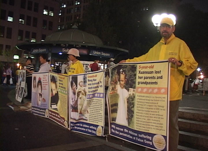 联合广场位于曼哈顿的交通枢纽处,忙碌了一天的人们喜欢在附近散步,此时是下班高峰期,可谓是车水马龙,好个热闹处。大大的蓝底白字横幅“帮助营救被迫害的法轮功孤儿”在背景处非常的醒目,前面台阶处摆放着十几幅法轮功学员及其幼小的孩子们被中共迫害的大型展板,在广场的外围还有各式“救救孩子们”的大图片,讲述着一个个真实发生、催人泪下的信仰“真善忍”的法轮功学员及其孩子们无辜遭受中共当局残酷迫害的悲惨遭遇。