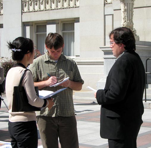 【明慧网2005年9月28日】(明慧记者黄凯莉旧金山东湾报导)2005年9月27日中午时分,现任的中国大连市长夏德仁率代表团来到奥克兰市政府与市长Jerry Brown会面。旧金山湾区的法轮功学员在市政大楼与夏一行狭路相逢。法轮功学员将美国联邦法庭的判决书尽力(Tendered)递交给他。