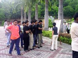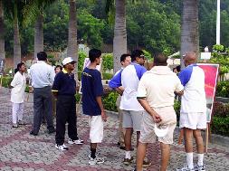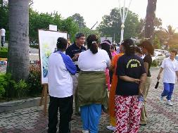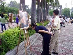 这次的“美术展”分成两个时段,就是早上7时至10时以及下午5时至7时進行。十多幅画摆在公园正门的中心地带;学员则在正门的左边演示法轮功五套功法,并右边摆了征集呼吁停止迫害签名的桌子;还有义务教功。