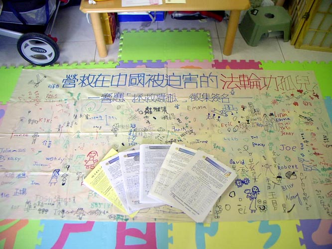 【明慧网2005年9月3日】为了营救在中国被迫害的法轮功学员遗孤,由明慧学校与台湾营救受迫害法轮功学员协会(简称台湾营救协会)发起征签与营救的活动,自2005年8月25日起即陆续展开,到9月2日止台湾营救协会已陆续收到台湾各个县市征签名单及布条,经过计算总共约2000个台湾小朋友及民众签名营救。