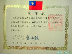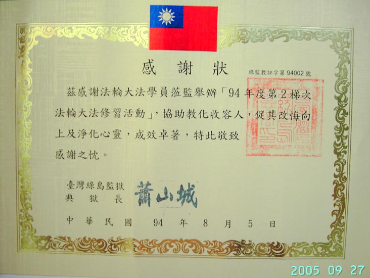 绿岛监狱秘书辛孟南先生颁发感谢状给法轮功学员