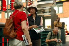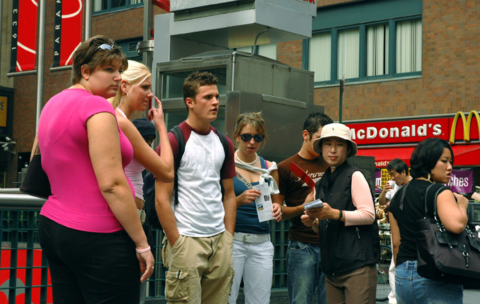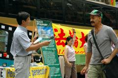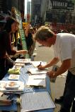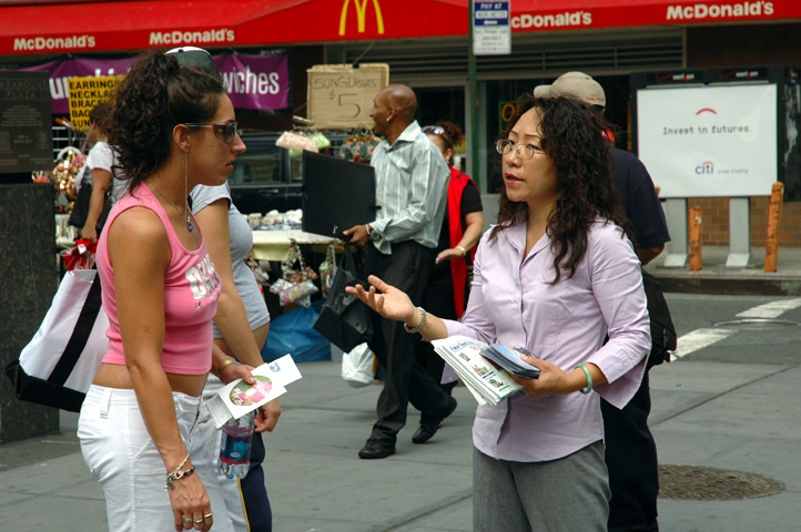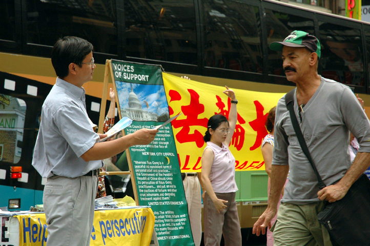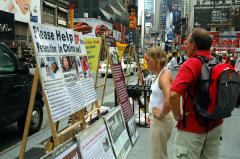 【明慧网2005年9月30日】2005年9月,法轮功学员继续在曼哈顿50街、和百老汇街(Broadway Street)街头,布起讲真象、反酷刑展览。来自加拿大、台湾、新西兰、美国的大法弟子利用假日、上班前后的时间前来参加。许多纽约人都说:“我已经看过了。”而有更多来纽约的各国观光客看了真象展后,表示受益匪浅。