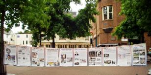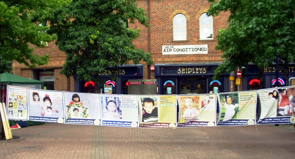 学员们在广场的边上挂起了横幅,讲述法轮功学员在中国遭受中共迫害的真象,并呼吁帮助营救因中共的残暴迫害而失去父亲或母亲,甚至双亲的孩子。学员们还设置了两张桌子以摆放法轮功真象资料和征签表,供人们取阅真象和签名支持。