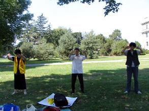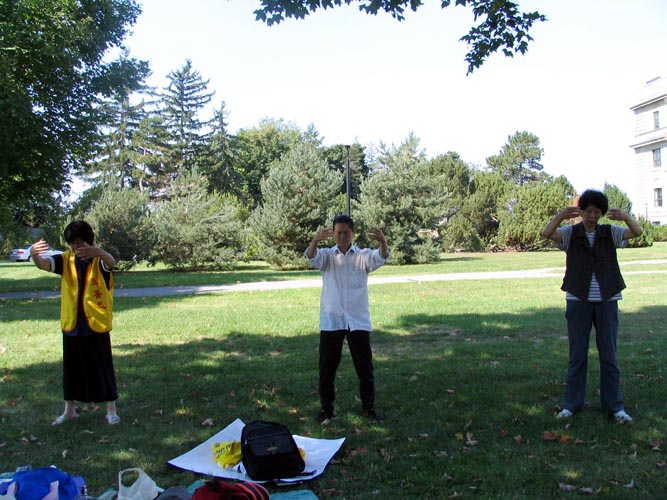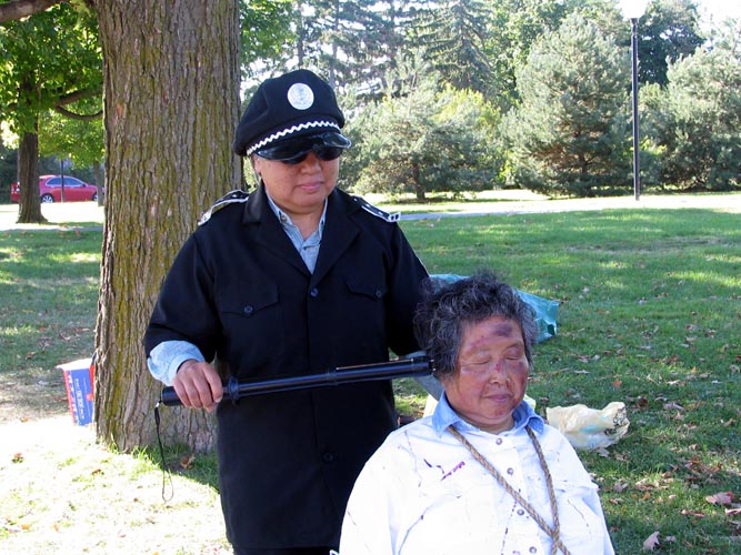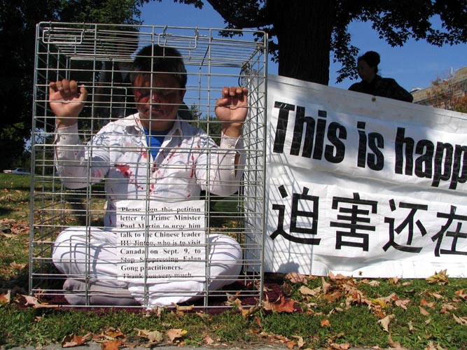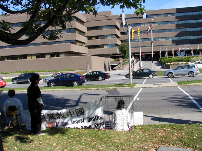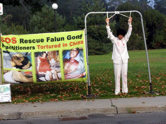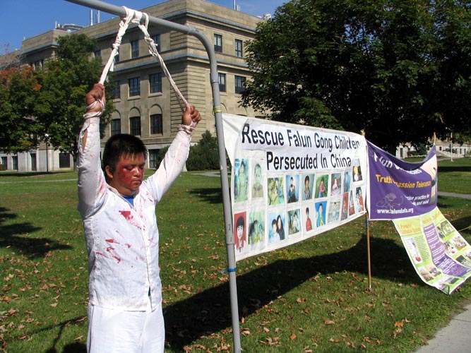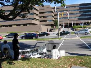 【明慧网2005年9月8日】二零零五年九月六日,加拿大法轮功学员于外交部大楼前做“反酷刑展”演示,呼吁政府阻止两名已被起诉的中共官员——薄熙来和夏德仁随胡锦涛入境。
