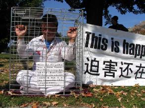 这是曾经在中国的劳教所里亲身经历过九个月迫害的法轮功学员,在演示劳教所里遭受的酷刑。