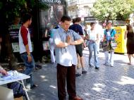 象这样的小故事在讲真象的活动中比比皆是,比如在傍晚,有三个清洁工出来清理路面时,正好遇到了我们的活动。在明白了真象后,其中一个人说: “我反对这个世界上所有形式的迫害,我完全支持你们。但愿我的真心(祝福)与你们同在!”