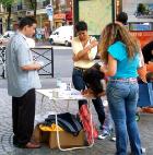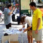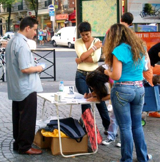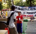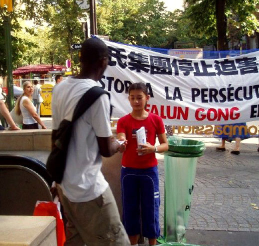 【明慧网2005年9月8日】巴黎西南部是巴黎最大的街区,为了让此地的居民了解到邪恶中共对法轮功学员的迫害真象,以及法轮大法真善忍的福音,2005年9月3日,法国法轮功学员把巴黎巡回洪法活动步伐,迈進了这里最繁华的地区──贡旺逊大街 (Rue de la Convention)。人们喜闻大法,并纷纷签名支持反迫害。