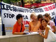 有四位女孩看到真象横幅后,主动迎上来询问真象。在得知中国正发生着对善良法轮功学员的野蛮迫害后,纷纷表示不满。当知道可以签名反对迫害时,她们高兴极了,立刻就签。其中一个说:“我支持法轮大法!我还要给母亲看这张我很喜欢的传单。”于是大法弟子又给了她一张真象传单。她高兴的说回去后还要发给别人。最后她们很开心的与学员在真象横幅前合影。
