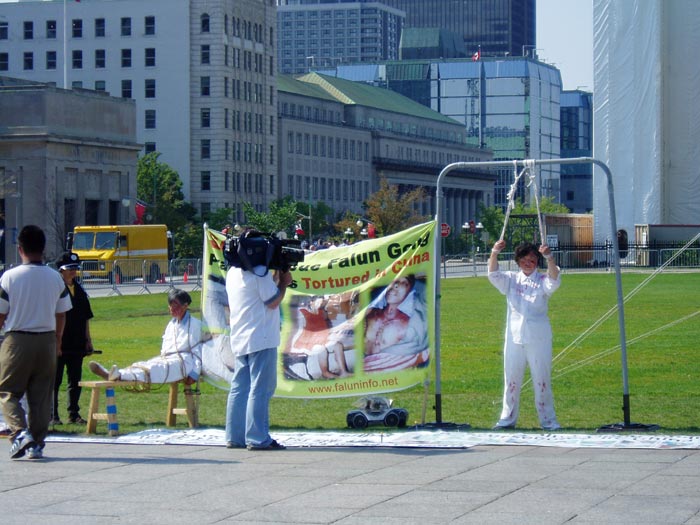 ![]() 加拿大国会议员大卫·乔高(Kilgour)在联名信上签名 | ![]() 国会山前反酷刑展引媒体关注 | ![]() 加拿大人在联名信上签名 |