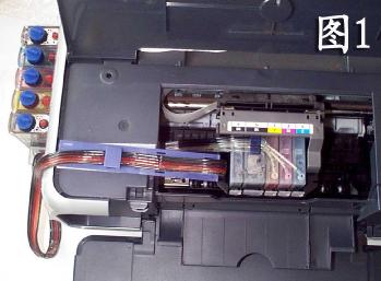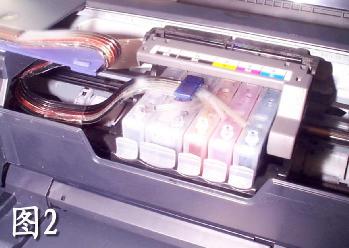 连续供墨系统厂商对佳能ip3000、ip4000打印机的连供走线的安装,提供了一套特殊的方法(如图1、图2),在图2上可以看到用管线支架反走线的方法,硅胶排管在管线支架末端向下折转固定在支架下面,利用打印机内部的空间留出够墨车左右移动的长度,这样就可以盖上打印机的上盖正常打印,不改动打印机的外观,还可以保留新打印机的一年期的保修,如果遇到打印机在一年内出现故障,拿下外部的供墨系统,换上原装墨盒即可送厂家的质保店免费保修。