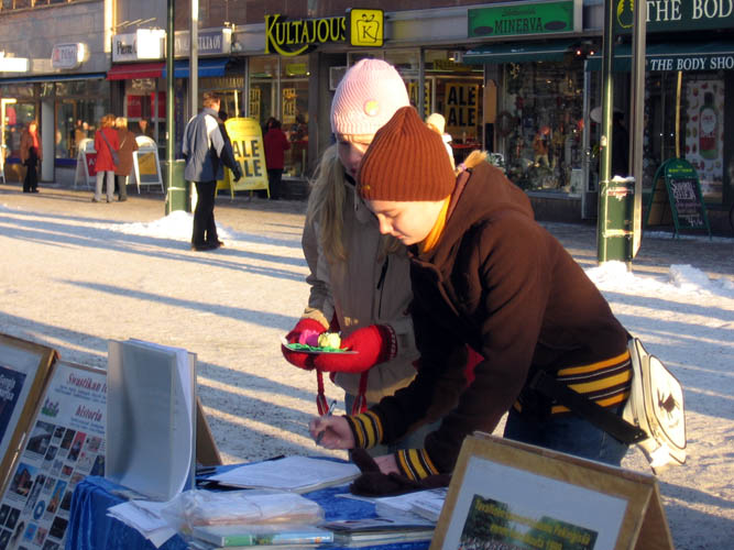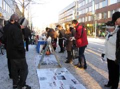 【明慧网2006年1月10日】2006年1月7日,新年伊始,部份芬兰法轮功学员来到芬兰东部城市科沃拉(Kouvola)市中心的步行街洪法、讲真相,将法轮大法的美好带给科沃拉民众,并把中共邪党六年多对法轮功学员残酷迫害的真相揭示给民众,呼吁人们一起努力制止这场迫害。