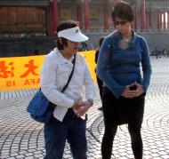 中正纪念堂因为其特殊的历史背景,所以成了许多中国人来台必访之地。法轮功学员在这儿炼功洪法讲真相已有一段时间。这群祥和的,或老或少、或男或女,来自社会各阶层的炼功人,很自然的成为中国大陆游客的焦点。他们就像摊在阳光下的法轮功真相,散发出的真诚善良特质,使中共邪党对法轮功的所有造假宣传瞬间瓦解。刚走了一团大陆游客,又进来了一团,团团都是有缘人,法轮功学员紧紧把握机会讲真相。