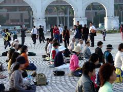 当天阳光灿烂,万里无云,广场上除了来自台湾各地的游客外,还有很多来自中国大陆、日本、韩国、新加坡、美国、加拿大、英国、法国、荷兰、以色列等世界各地的游客。驻足围观的游客中,有已经知道法轮功的,也有从来都没听过法轮功的,但是从他们兴趣盎然的看着炼功的法轮功学员,仔细的读着刚拿到的法轮功简介和不时的举起手中的相机按下快门的动作来看,这个午后的炼功团体似乎成了这些游客此行的旅游重点。