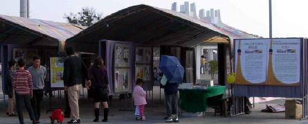 近午时分,一群大陆游客途经展览场旁,他们目光触及展出的照片,随即加快脚步匆匆走过,工作人员上前邀请,前列的几位口中咕哝,双手交叉胸前表示拒绝,当他们即将远去,忽有一人绕进展览场,在服务台前翻阅陈列的材料,工作人员便以“正法之路”画册及其它真相材料相赠,他拿了材料迅速跟上队伍……。约摸过了个把钟头,这群中国游客在回程中重返展览会场,这次他们主动停下,并纷纷索取各项材料,其中更有人指定想看“正法之路”。大家目送这一群远道的游客,心中由衷致上真诚的祝福。