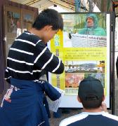 首日展出,不约而同来了一些当地的小朋友,他们听完学员亲切的介绍后,明白了做人要诚实、善良、坚忍的道理,随即决定要帮忙做好事,他们穿梭在展览场周围,协助捡起被少数游客遗落在地上的真相传单和简介。另一位约摸6、7岁大的小朋友来到服务台前,指着莲花书签说他看到了美丽的菩萨,工作人员依“法轮大法好”的字体逐字教他诵读,他不太识字,反复数次终于学会,便高兴的答应:以后要做善良的小孩,时常诵念“法轮大法好”。隔日,他又邀了姐姐到展览场帮忙派发大法简介、洪法书签。