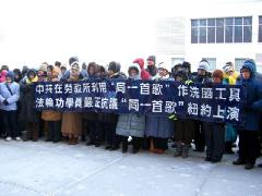 法轮功学员代表Levi在集会上首先发言,他指出:“同一首歌”是中国劳教所里一首著名的“迫害伴奏曲”——几年来,它已成为中共杀人不见血的工具,被用来从精神上摧残法轮功修炼者。在劳教所,每当有诋毁法轮功的重大活动时,在活动中都要唱这首迷魂曲、迫害伴奏曲。当一名法轮功学员被洗脑后的第一件事不是写“三书”,而是唱“同一首歌”。劳教所的人一听到这首迫害伴奏曲,就知道有人被洗脑了。歌声的背后,是迫害者血腥的暴力,险恶的欺骗,是中共迫害人权和人类精神的残酷。今天我们来到这里,严厉谴责几年来邪党中共对法轮功学员的残酷迫害,严正谴责邪党中共把浸透着血腥、充满着暴力的“迫害伴奏曲”输出到海外,到纽约上演。
