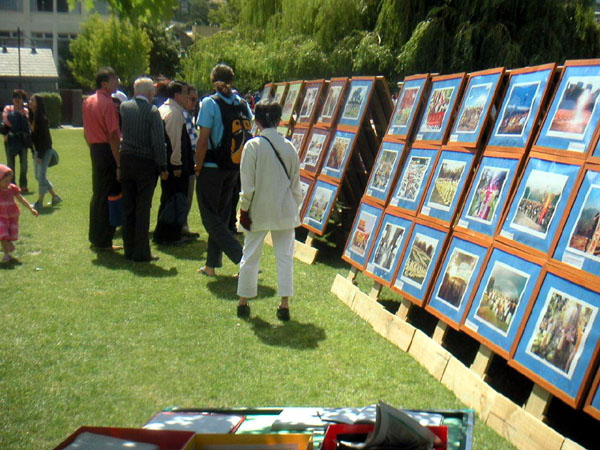 摄影展刚准备好,一对来自中国大陆的夫妇就到了跟前,他们由于受了邪恶中共造假宣传的影响,对法轮功心存不少疑虑与误解。法轮功学员就耐心的一个一个的把事实真相告诉他们。他们知道真相后,笑逐颜开,并向学员表示感谢。