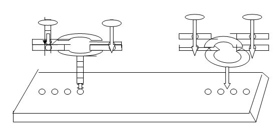 固定“抻床”:人仰面躺在木板床上成大字形,木板床上有四块钢板固定在两手腕和两脚脖处,每块钢板30cm见方,厚1cm,上面钻有带螺丝扣的密密麻麻的圆孔,用以固定手和脚扣子的。4个大铁扣子,每只手脚各一个,铁扣子由两个半圆形的环构成,分上下两个半圆,两个半圆由两根螺丝杆连接,下环半圆有立柱,立柱有螺丝扣,插入钢板孔内,起固定作用,并与床板离开距离,起到“抻”的作用。扣子的立柱插入钢板不同的孔内可调节“抻”的松紧程度。