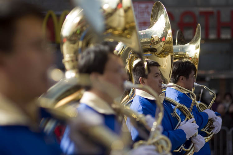 参加游行的社团华裔和韩裔占了一多半,也有菲律宾及马来裔等团体,可谓是和谐喜气各族同庆。许多人穿上了节日的盛装,表演出最拿手的绝活,观众目不暇接,时时报以热烈的掌声。在所有的参加游行的队伍中,法轮功学员的方阵无疑是最光彩夺目的。队伍中有军乐队、仙女队、炼功队和腰鼓队,整个队伍绵延近四个街区。特别是首次亮相的法轮功军乐队(Marching Band)引来人们连连赞叹,许多华裔观众不断的鼓掌、叫好,还有的兴奋的举起大拇指表示称赞,有的华人观众还兴奋的将双手举过头顶来鼓掌和叫好。一位亚裔观众对记者说:这些年法轮功经历了许多魔难,但他们做的很好,很平和。