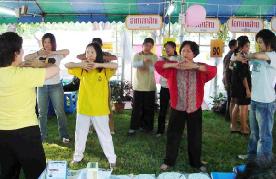 在这几天当中,每天都有很多人来此获取各种简介、听到不同健康方面的演讲。法轮功展位悬挂着大法轮图,摆放着《转法轮》、功法演示图、真相资料、光盘等,并播放法轮功学员创作的音乐和洪法VCD。每天学员们都在此展示五套功法,吸引了许多民众,不少人当场学功、索要大法介绍资料。