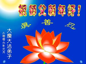 伟大慈悲的师尊:您好!新年将至。我们——您遥远家乡的弟子,怀着无以言表的万分思念之情向在大洋彼岸的慈悲伟大的师尊,献上我们发自心底的祝福:祝慈悲伟大的师尊新春愉快、幸福、安康。慈悲的师尊,您家乡的大法弟子盼您