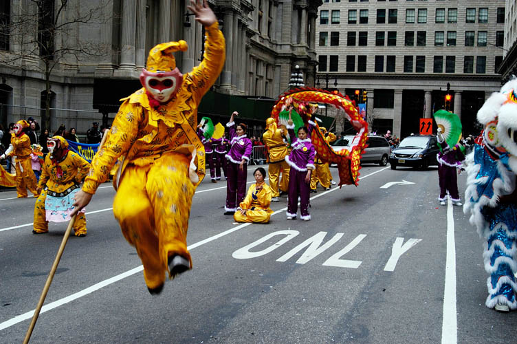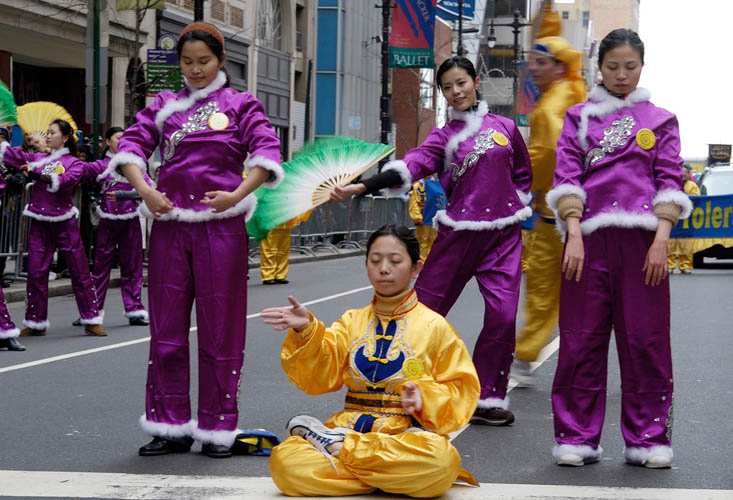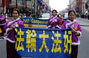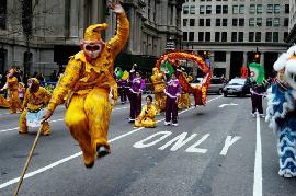 法轮功学员打着“世界需要真善忍”、“法轮大法好”等横幅,表演着舞龙、舞狮、大头娃娃、猴王孙悟空、扇子舞,还有宁静的打坐和功法表演,让一路上的观众喝彩不已。很多华人观众能在长长的游行队伍中看到唯一华人的面孔,感到很亲切,也为法轮功把中国文化的祥和美好带入主流社会而自豪。一位华人女士说:“这是今天我所看到最美的表演。”