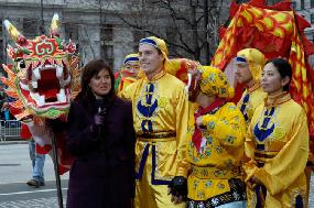“祝大家新年快乐!1月29日将是中国的新年--狗年,祝大家中国新年快乐!”法轮功学员一路上不停地用喇叭向观众祝福着。