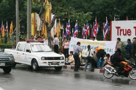 在中共使馆前等候的还有泰国警察。学员的抗议活动开始后,警察的人数增加到近30名,这些警察分属不同的部门,还有来自总理办公室的代表。法轮功学员利用这一机会深入的向这些官员和路人讲真相。