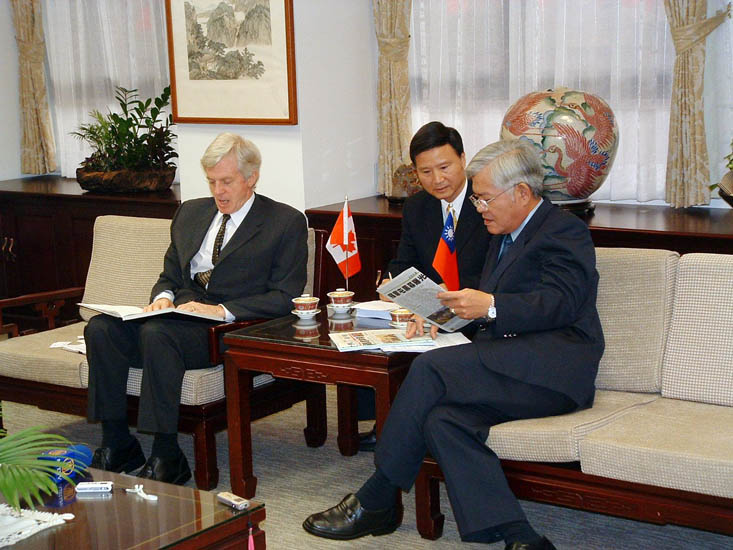 ![]() 十二日法务部政务次长李进勇(右)接见加拿大前亚太司司长大卫·乔高 |